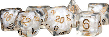 Generation2 pearl dice are infused with beautiful iridescent pearls. These are full-sized 16mm polyhedral dice sets that come with 7 dice (d4, d6, d8, d10, d10 (00-90), d12, and d20).