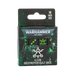 This is a set of 16 six-sided dice with squared edges for use in games of Warhammer 40,000, themed around the Necron destroyer cults. They are cast in black gem-effect acrylic plastic with light green ink markings, and measure 16mm along each edge. The 1-5 facings are traditionally pipped, and each '6' face is decorated with the twisted icon of the Necron destroyer cults. These themed dice are only available while stocks last.