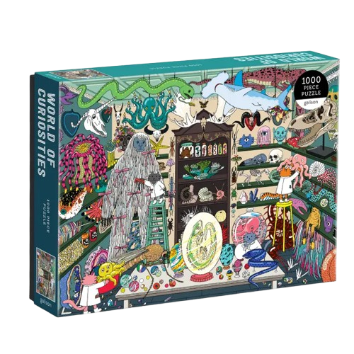Faire1000 PIECE PUZZLE – World Of Curiosities 1000 Piece Puzzle by Galison is a medley of humorous and spooky objects curated within a shop of curiositi...