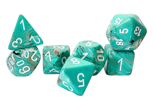 ACDFor use in tabletop RPG games (such as Dungeons & Dragons).Contains 7 Marble Oxi-Copper™ Dice with white numbers in the following Shapes:1 x Me...