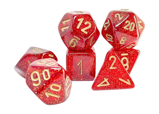 ACDFor use in tabletop RPG games (such as Dungeons & Dragons).Contains 7 Glitter Ruby Dice with gold numbers in the following Shapes:1 x Mega 20-s...