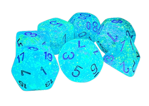 ACDFor use in tabletop RPG games (such as Dungeons & Dragons).Contains 7 Luminary Sky Dice with silver numbers in the following Shapes:1 x Mega 20...