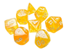 This set contains 8 Borealis Canary dice with white numbers with the following shapes